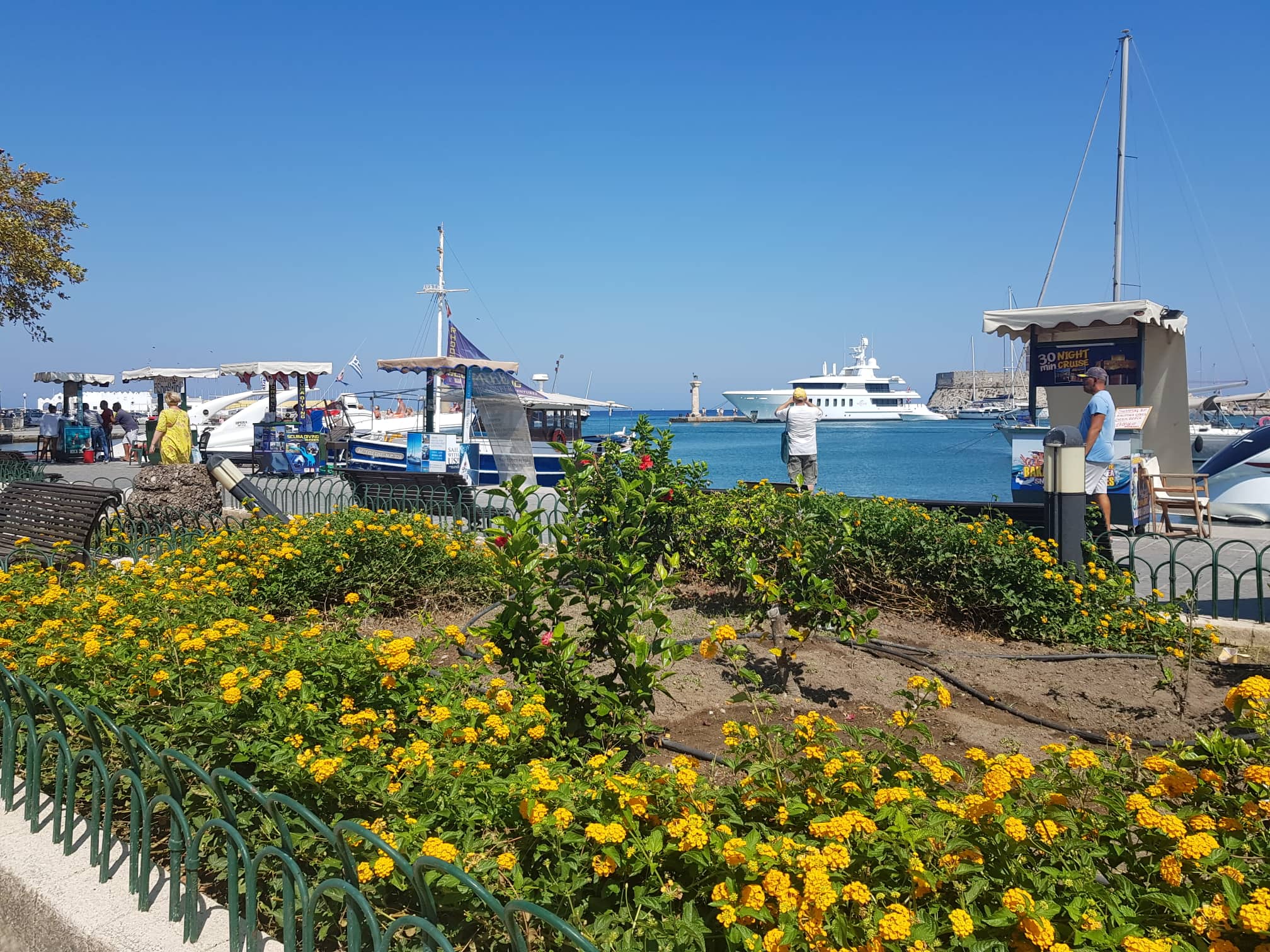 Będąc w mieście Rodos, trzeba przejść się wzdłuż portu Mandraki. Po prawej stronie będziemy mieć widok na port, morze oraz kilkanaście budek, w których sprzedają wycieczki, bilety promowe i rejsy. Przy okazji można coś kupić lub zabrać ze sobą ulotki, by na spokojnie zdecydować, jaka oferta nas interesuje. Po lewej stronie stoją budynki z okresu włoskiego, a na końcu kościół Zwiastowania z fontanną Lwów. Przy wejściu do portu stoją na kolumnach jelonek i łania, a za nią okrągła twierdza św. Mikołaja z latarnią pośrodku. Zwiedzanie Nowego Miasta możemy też odbyć mini kolejką, która zawiezie nas również na rodyjski Akropol.