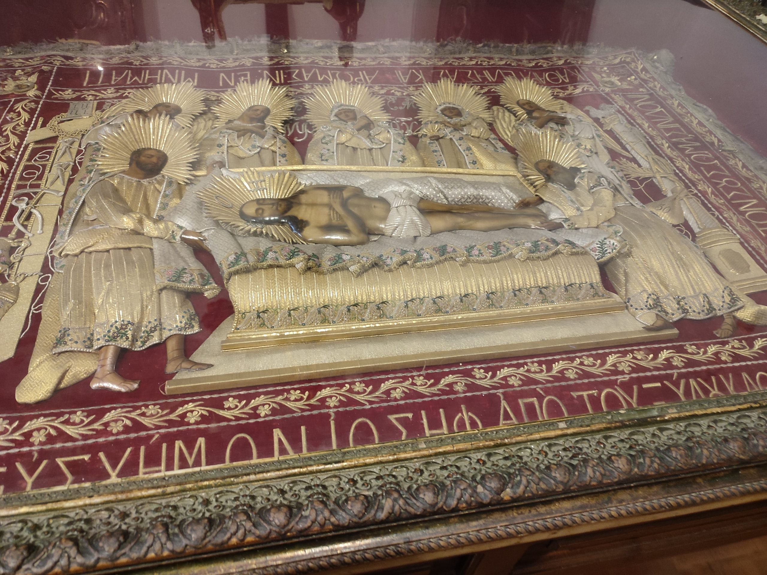 Niezwykłą pamiątką artystyczną jest też dar konsula rosyjskiego w Konstantynopolu Zachariasza Zacharowa dla ówczesnego opata Ierotheosa Fotiadisa. Był on wówczas przez pewien czas nauczycielem jego syna. W ramach podziękowania podarował mu on duże (1,20 × 1,80) wyszywane złotem epitafium, które zostało wykonane w 1852 roku.