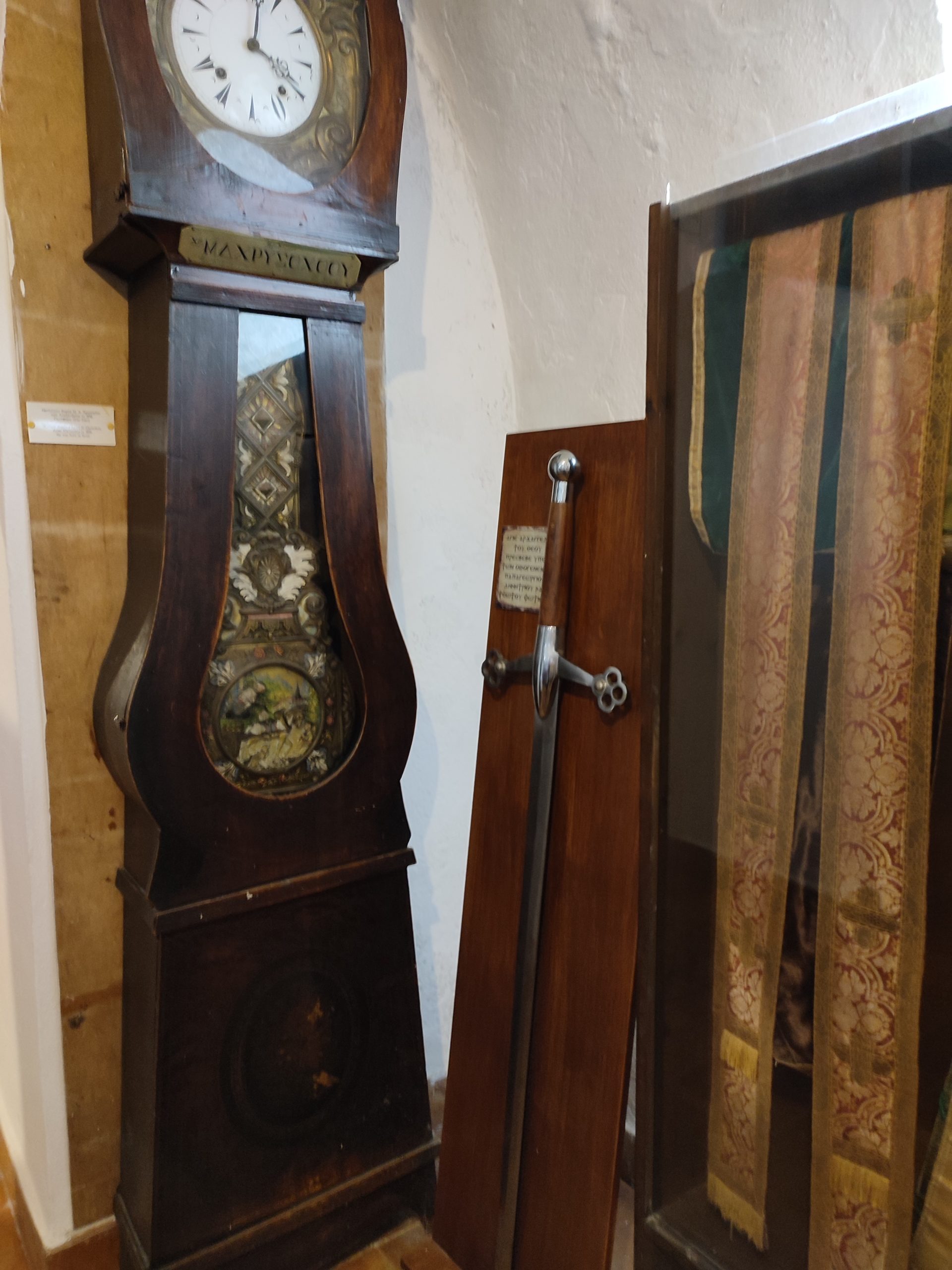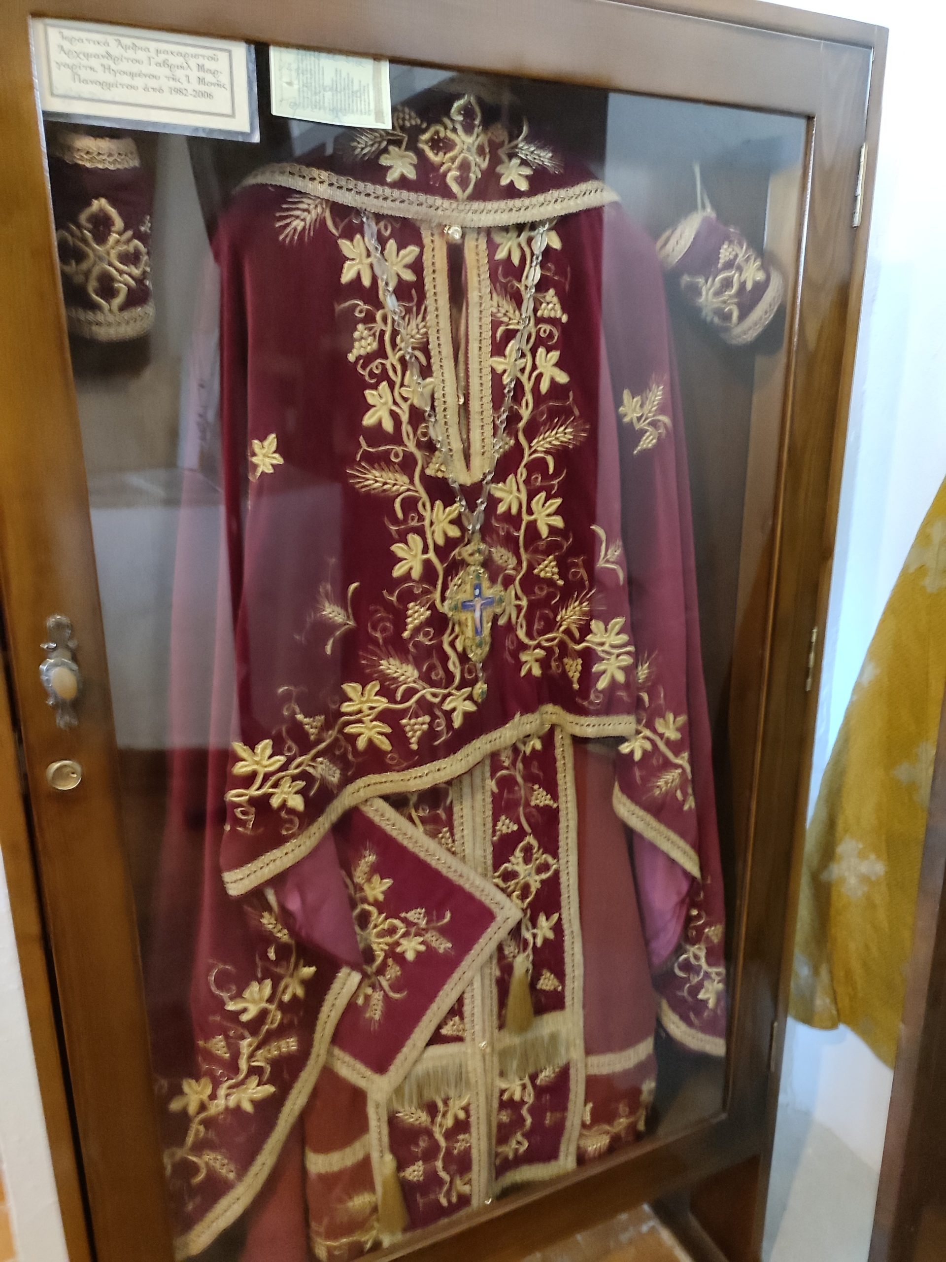 Dalej znajdują się wyłącznie obiekty kościelne, głównie szaty liturgiczne, stare rękopisy, ale także tablica litograficzna. W tej samej przestrzeni zachował się również duży zegar z wahadłem i mechanizmem naciągowym, pochodzący z 1896 r., pochodzący z Aleksandrii w Egipcie. Został podarowany klasztorowi przez Chrysochou, pochodzącego z Symi.