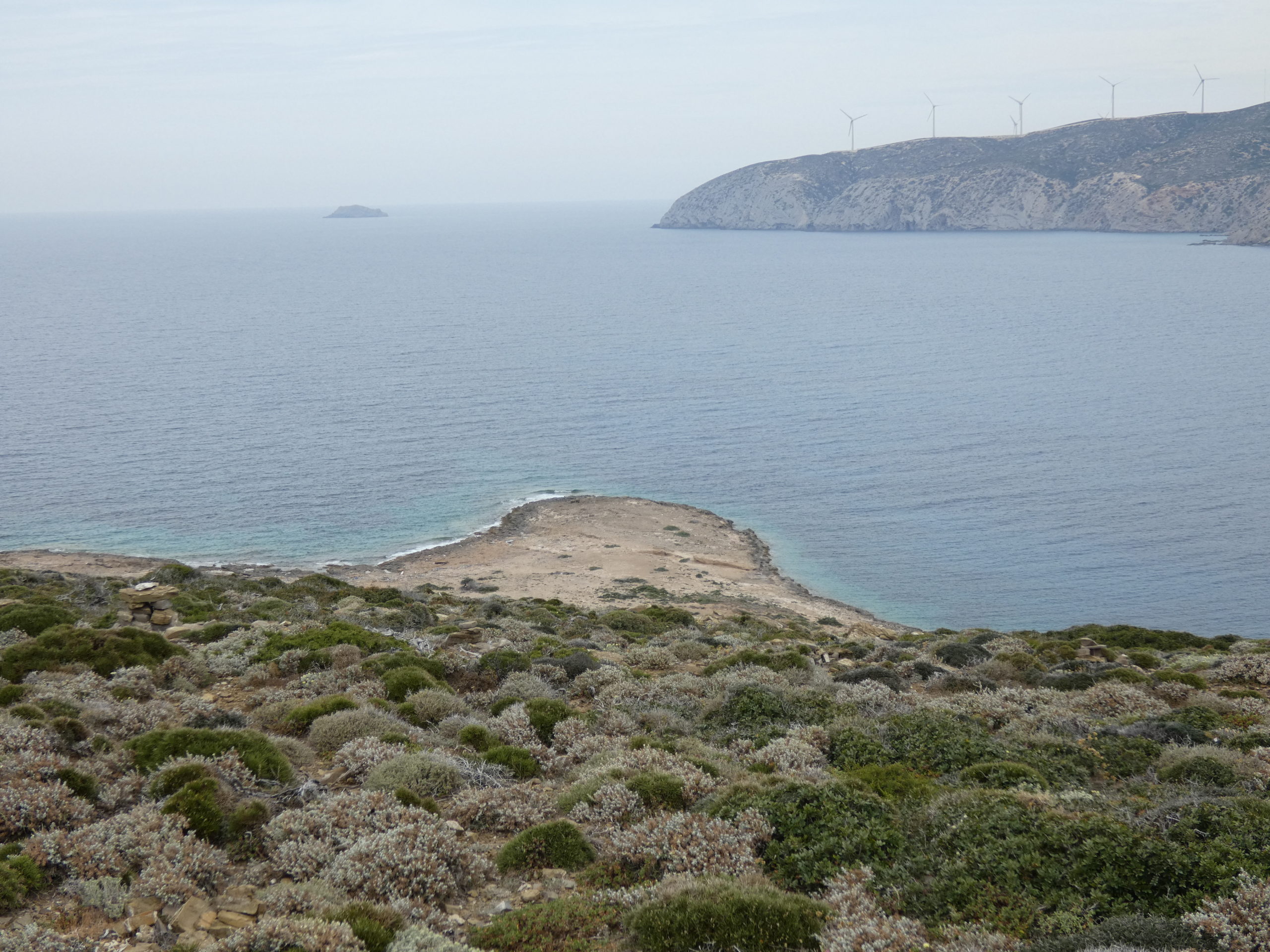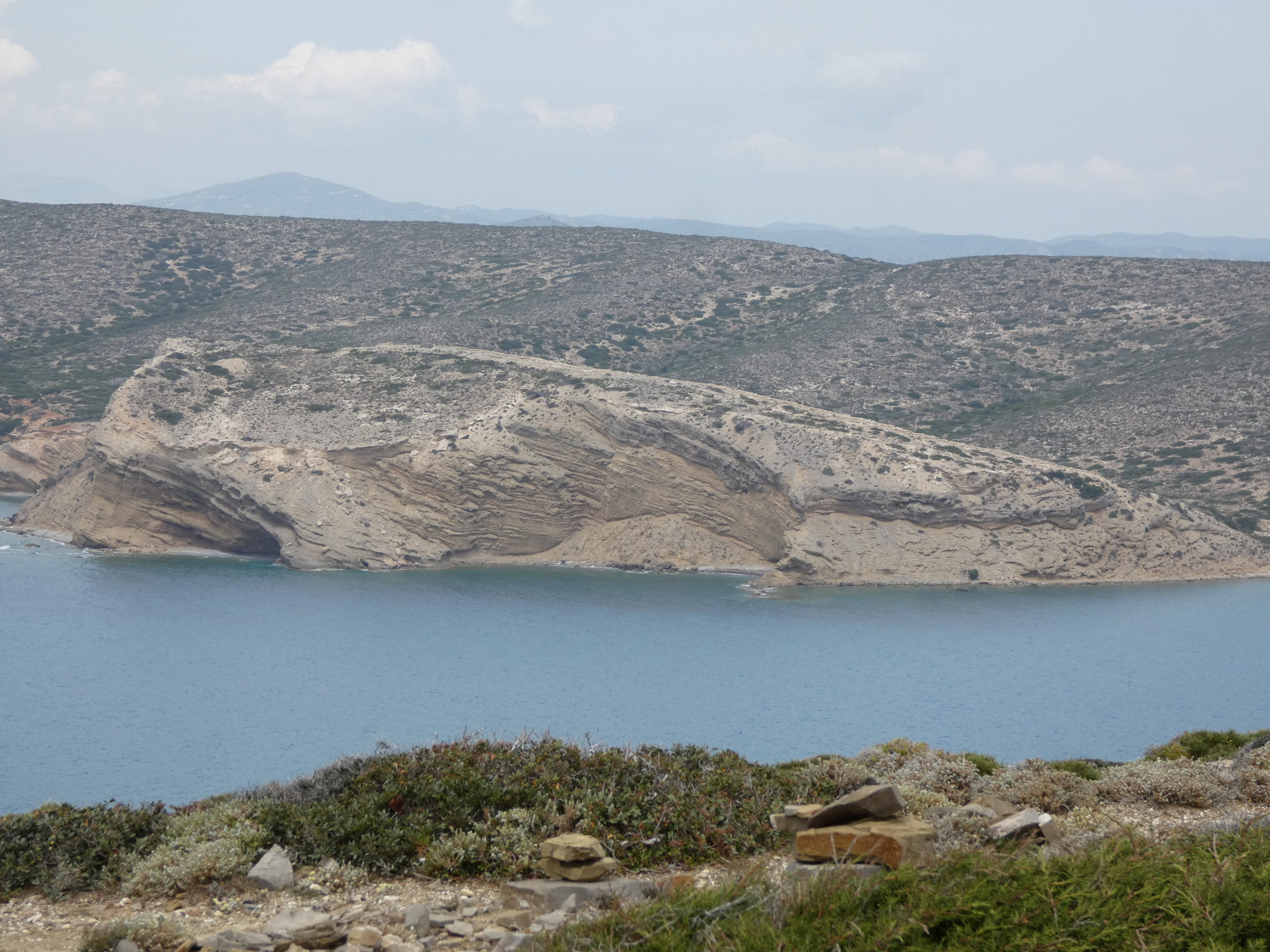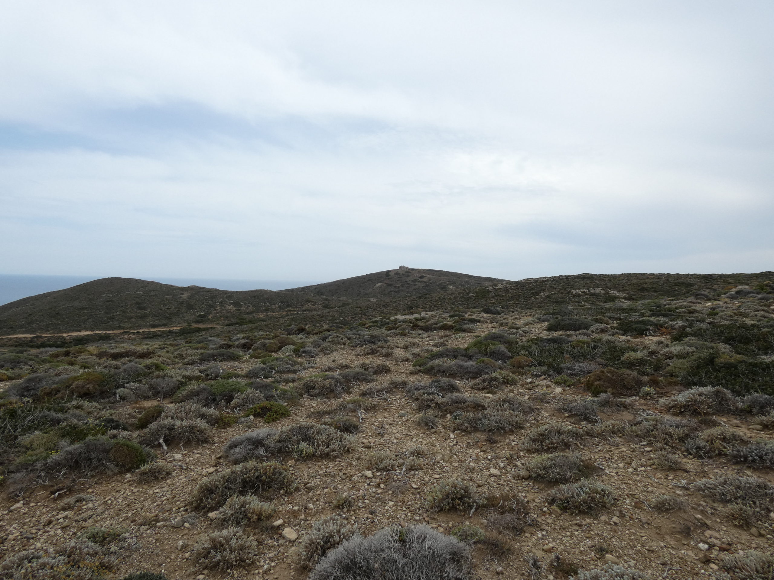 My skierowaliśmy się w prawa stronę, która była bardziej skalista i pokryta drobnym żwirem. Następnie podążyliśmy na południe wzdłuż wybrzeża, równolegle do pierwszej drogi, która przecinała wysepkę, prowadząc przez jej środek. Po wdrapaniu się na kolejne wzgórze zobaczyliśmy kolejne wzniesienie. Wydawało nam się, że gdy wejdziemy na jego szczyt, to zobaczymy latarnię. Nic bardziej mylnego. Gdy weszliśmy na górę, to latarni nie zobaczyliśmy. Udało się to dopiero za trzecim wzgórzem. Końcowy odcinek był bardziej stromy, pokryty żwirem, kamieniami, kawałkami marmurowych płyt i rosnącymi między nimi roślinami. Bardziej odpowiedni dla kozic niż dla ludzi. Dlatego, jeśli macie wybór, wybierzcie drogę przez środek wyspy, która jest może nieco dłuższa, ale za to łatwiejsza. Na wyspie znajduje się też kilka ładnych plaż, na których można się zatrzymać.