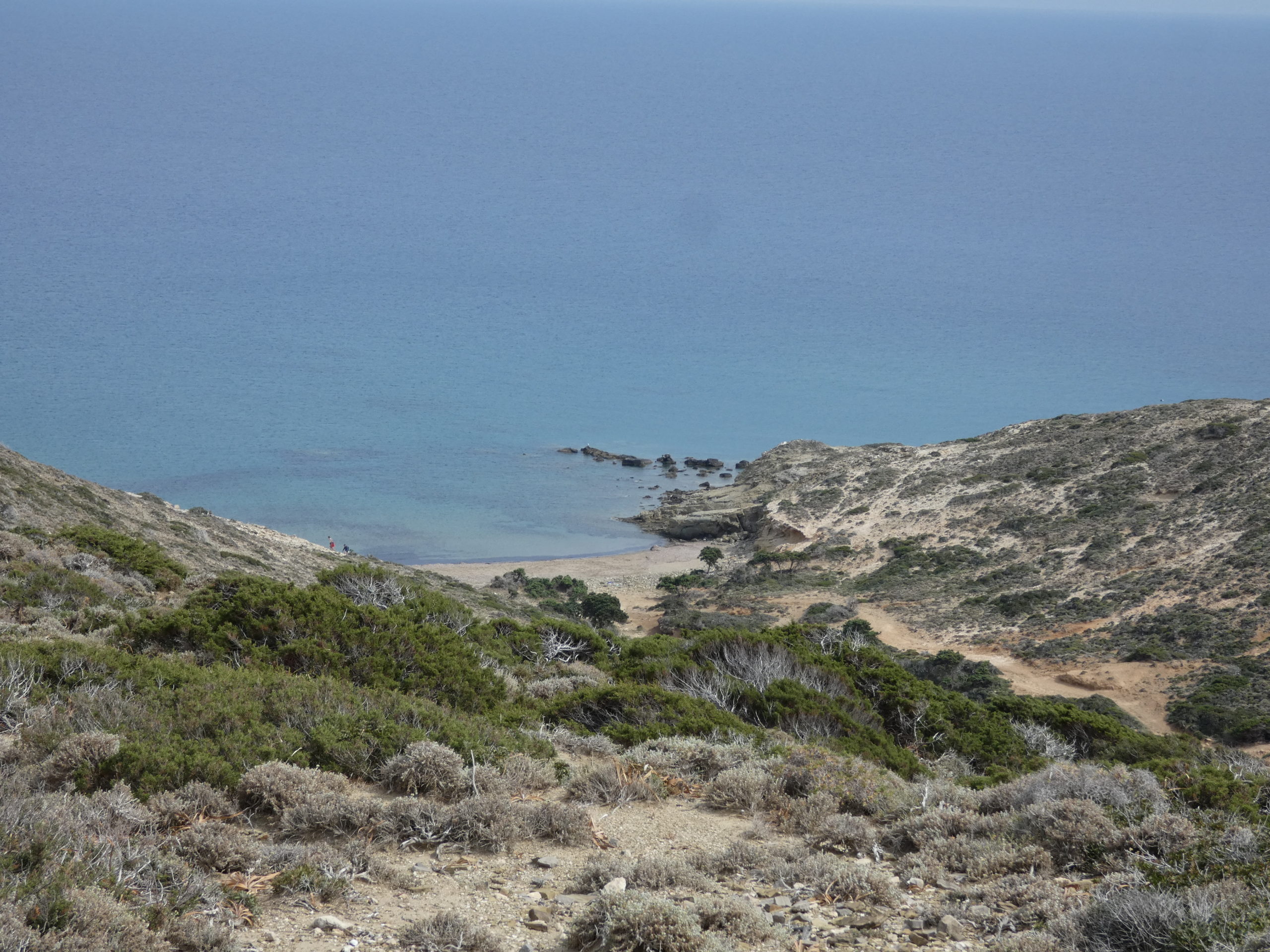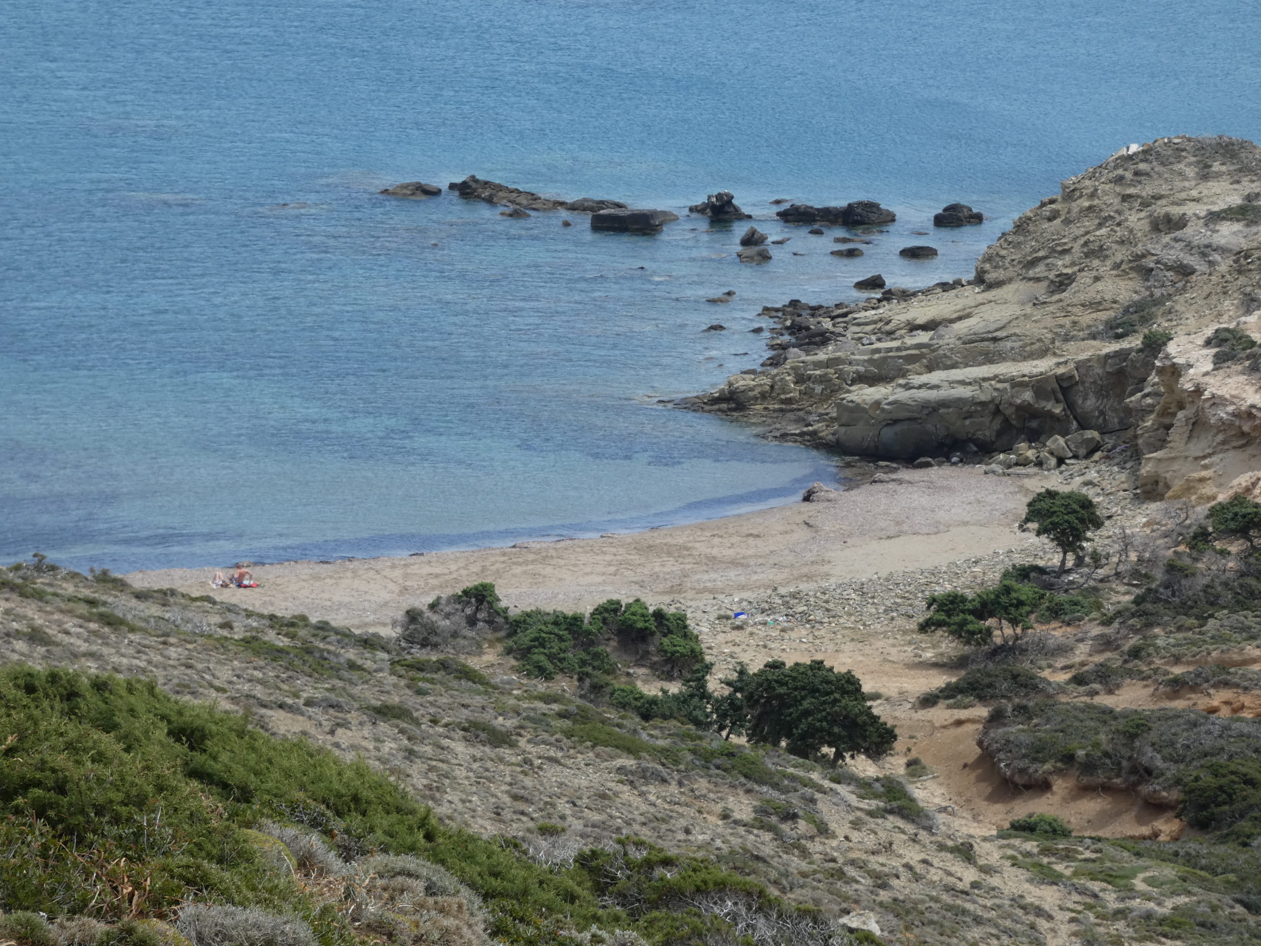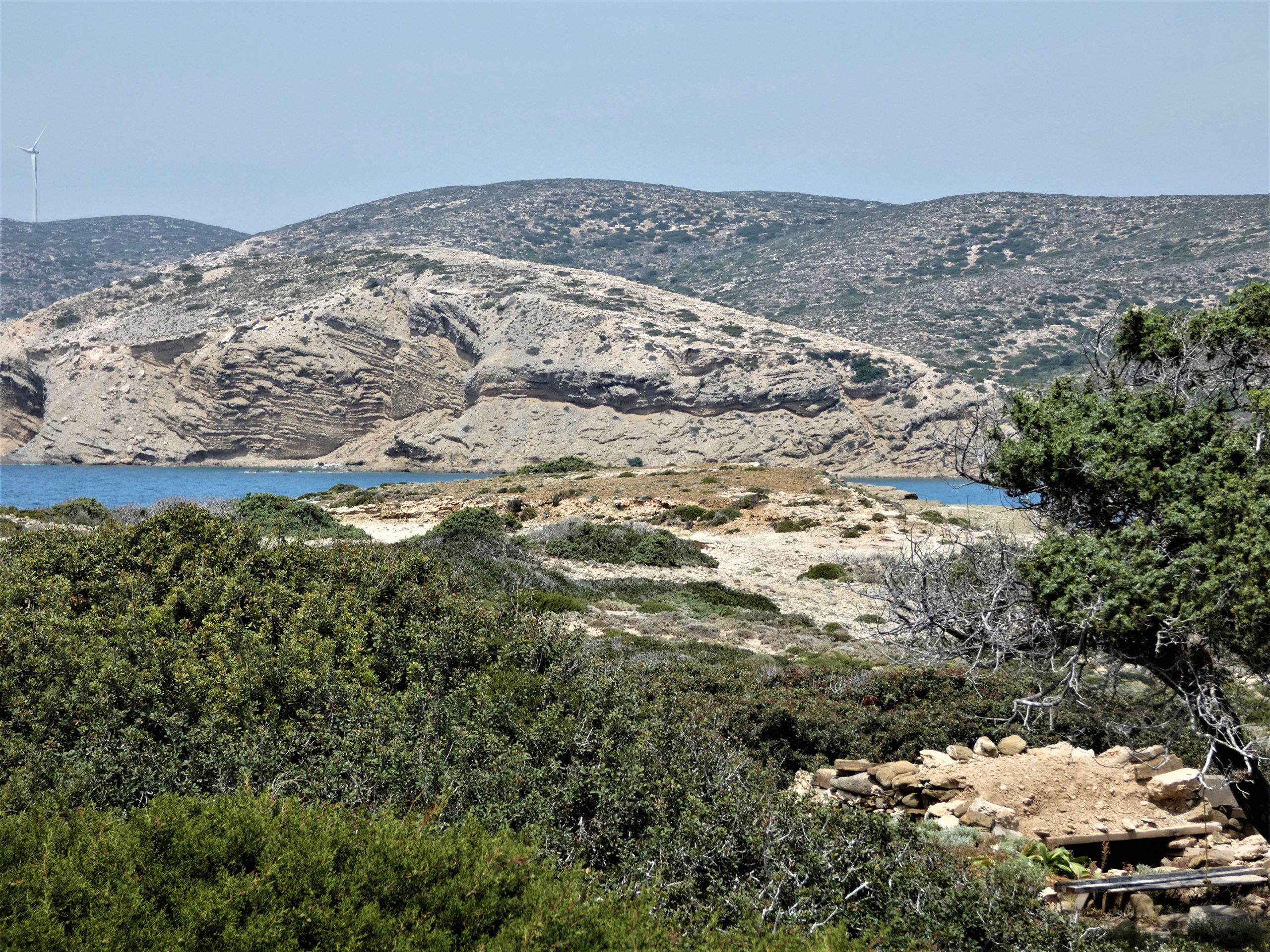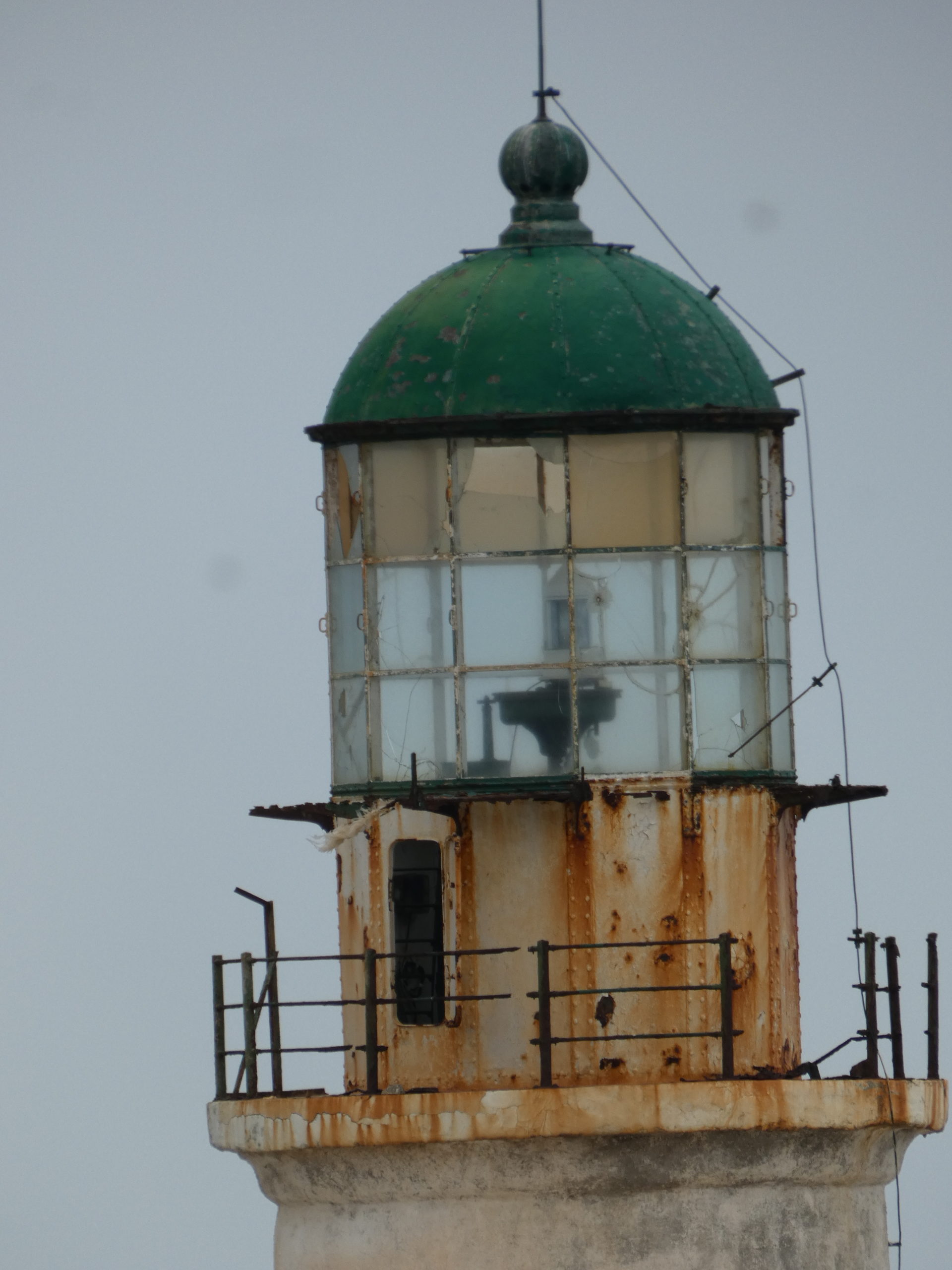 My skierowaliśmy się w prawa stronę, która była bardziej skalista i pokryta drobnym żwirem. Następnie podążyliśmy na południe wzdłuż wybrzeża, równolegle do pierwszej drogi, która przecinała wysepkę, prowadząc przez jej środek. Po wdrapaniu się na kolejne wzgórze zobaczyliśmy kolejne wzniesienie. Wydawało nam się, że gdy wejdziemy na jego szczyt, to zobaczymy latarnię. Nic bardziej mylnego. Gdy weszliśmy na górę, to latarni nie zobaczyliśmy. Udało się to dopiero za trzecim wzgórzem. Końcowy odcinek był bardziej stromy, pokryty żwirem, kamieniami, kawałkami marmurowych płyt i rosnącymi między nimi roślinami. Bardziej odpowiedni dla kozic niż dla ludzi. Dlatego, jeśli macie wybór, wybierzcie drogę przez środek wyspy, która jest może nieco dłuższa, ale za to łatwiejsza. Na wyspie znajduje się też kilka ładnych plaż, na których można się zatrzymać.